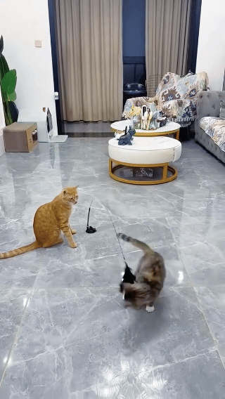 A vara se movimenta com o toque do gato, criando efeito elástico natural.